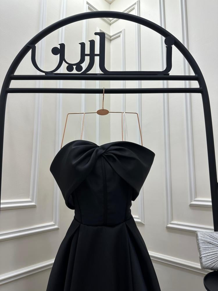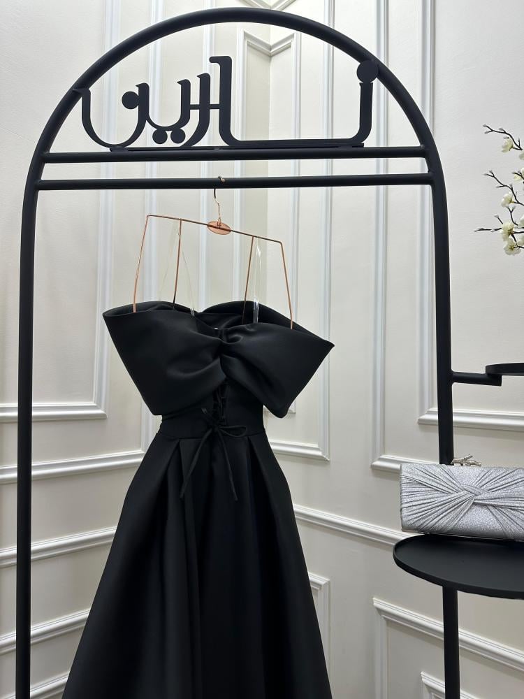 الجزء العلوي: بدون أكمام (سترابلس)، مزين بعقدة كبيرة على الصدر على شكل فيونكة بارزة، تمنحه طابعاً مميزاً وجذاباً.