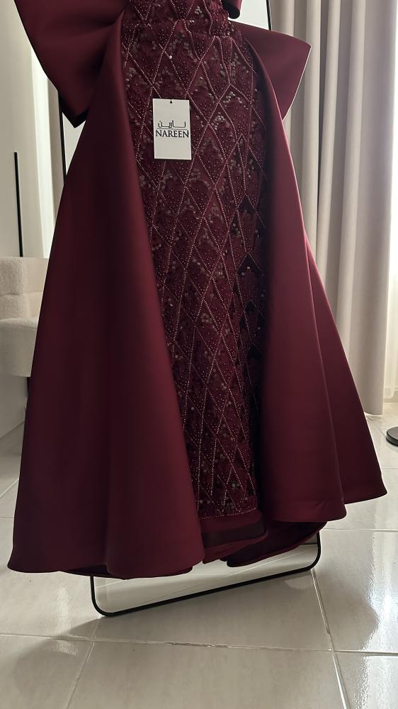 الطبقة الخارجية مصنوعة من قماش ناعم وسميك ينسدل بانسيابية أنيقة حتى الأرض، مما يضفي على الإطلالة فخامة ملكية مثالية للسهرات والمناسبات الراقية.