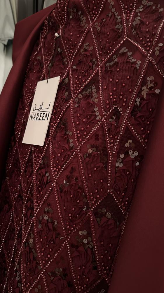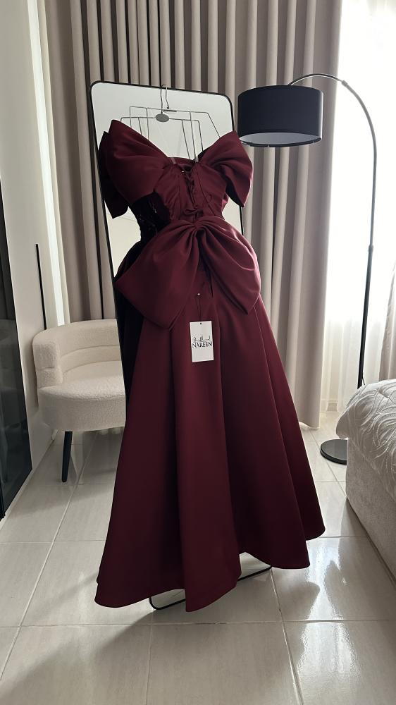 فستان سهرة فخم باللون النبيذي الداكن، يجمع بين الأناقة والفخامة في تصميم واحد لافت. يتميز بقصة ضيقة تبرز أنوثة القوام، مع خامة مطرزة بتطريز فاخر لامع بنقوش هندسية تضيف لمسة من الرقي. الجزء العلوي بدون أكمام وبصدر مكشوف، يزينه في الأعلى وفي الجانبين فيونكات كبيرة تمنح التصميم طابعًا دراميًا فخمًا ومميزًا.
