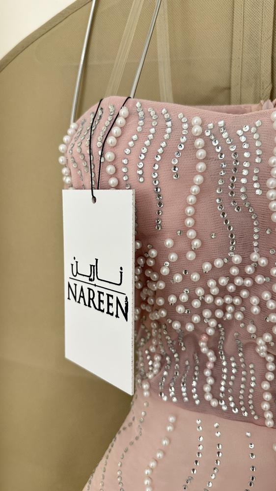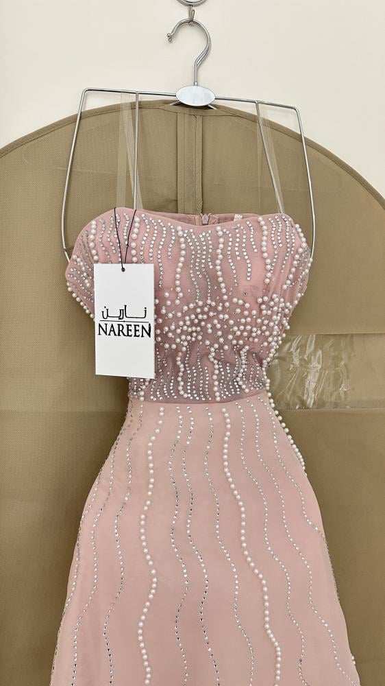 فستان أنيق وفاخر باللون الوردي الفاتح، يتميز بقصة ضيقة من الأعلى تتسع تدريجياً نحو الأسفل على شكل "A-line"، مما يمنحه طابعاً أنثوياً راقياً. الجزء العلوي بدون أكمام وبصدر مكشوف (سترابلس)، مزين بكثافة بتطريزات لامعة وكريستالات صغيرة تضيف لمسة من الفخامة والبريق.