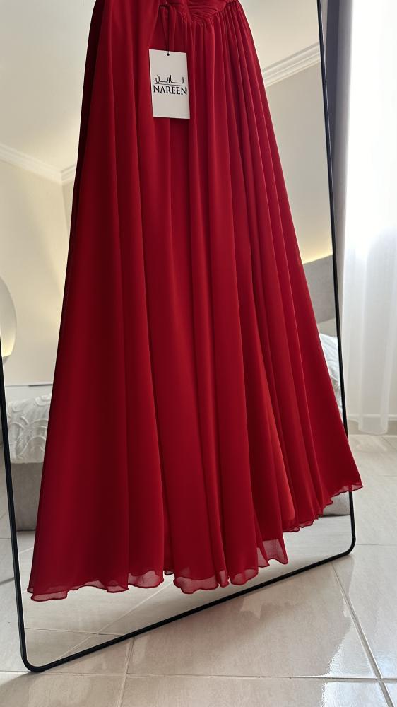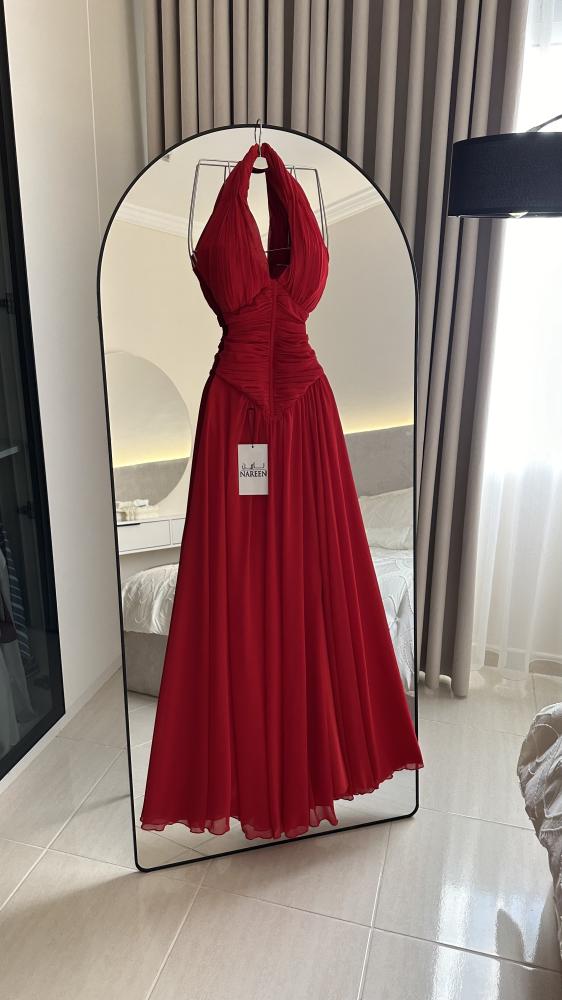 فستان سهرة أحمر أنيق بتصميم ساحر، يتميز بياقة هالتر مفتوحة مع صدر مكشكش يبرز جمال القوام، وحزام عريض بكرانيش ناعمة يحدد الخصر بشكل أنثوي. تنسدل التنورة الواسعة بخامة انسيابية خفيفة تمنحك حركة رشيقة وحضورًا ملفتًا في المناسبات. خيار مثالي لإطلالة فخمة وجذابة في الحفلات والسهرات.