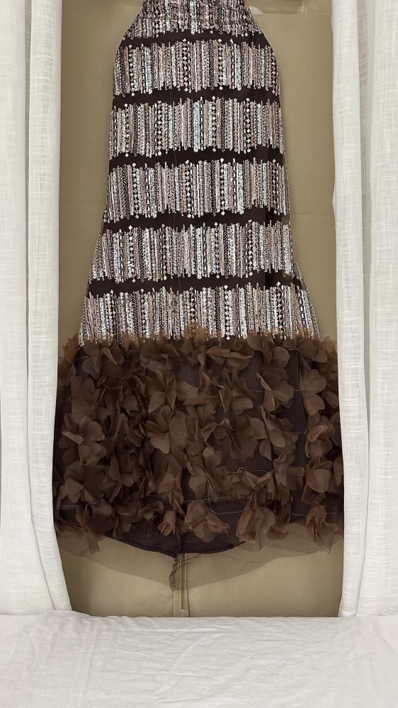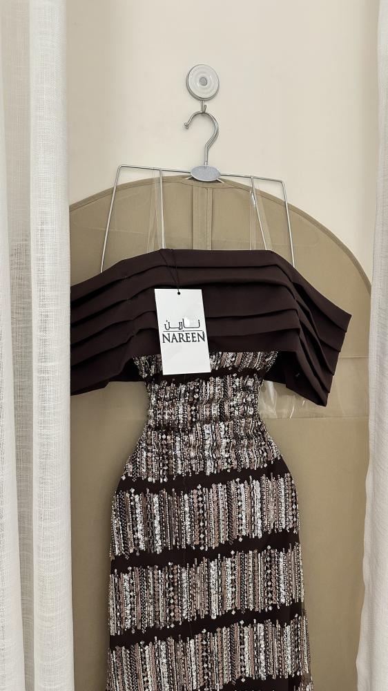 فستان سهرة فاخر باللون البني الداكن، يتميز بتصميم أوف شولدر مع طبقات قماش عريضة على الصدر لإطلالة أنيقة وجذابة. يأتي بقصة ضيقة تبرز انحناءات الجسم، ومزين بخطوط أفقية من الترتر اللامع باللون الفضي والبني لإضفاء لمسة فاخرة ومشرقة. ينتهي الفستان بتفاصيل من الورود ثلاثية الأبعاد المصنوعة من القماش على الحافة السفلية، مما يضيف بعداً أنثوياً راقياً. مناسب للمناسبات الخاصة والحفلات المسائية.