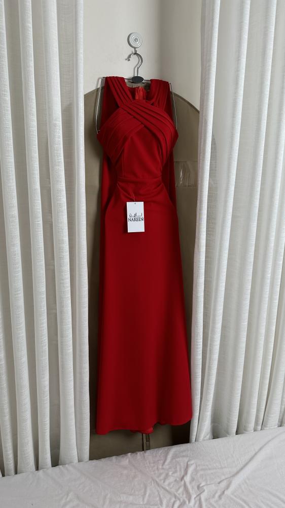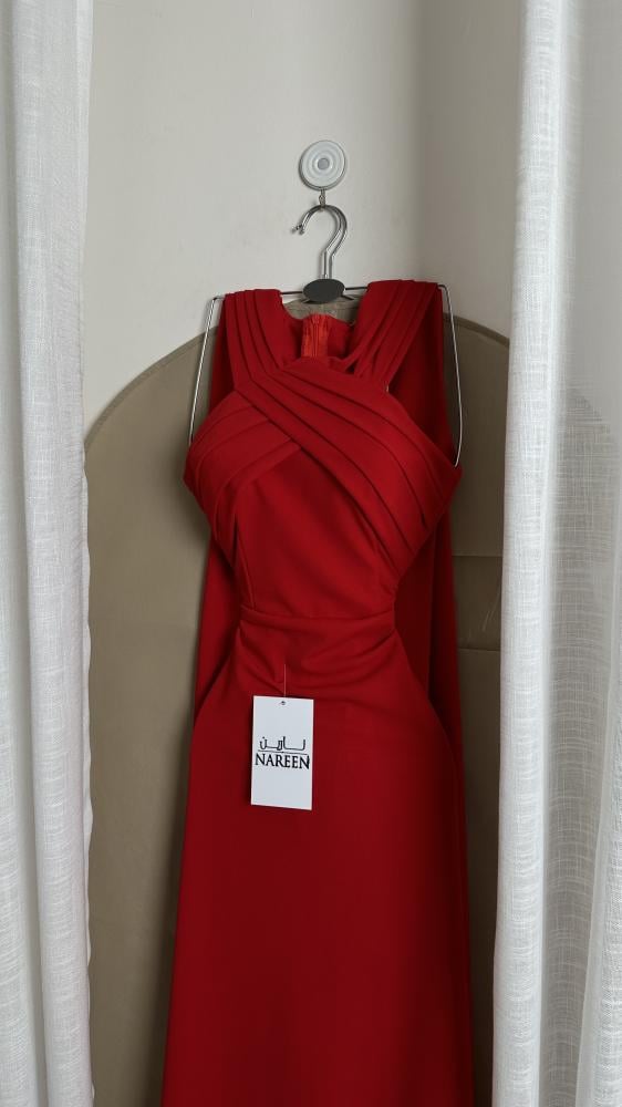 الفستان في الصورة هو فستان سهرة أنيق بلون أحمر جذاب، يتميز بتصميم راقٍ يبرز أنوثة القوام. الجزء العلوي جاء بتفاصيل مطوية متقاطعة عند منطقة الصدر تضفي لمسة فخمة وعصرية، مع أكتاف عريضة تعطي مظهراً أكثر توازناً وأناقة. القصة العلوية ضيقة عند الخصر لتحديد الشكل وإبراز القوام، بينما ينزل القماش بانسيابية نحو الأسفل بشكل مستقيم وأنيق يمنح إطلالة راقية وملفتة.