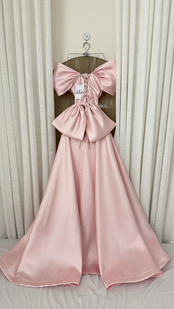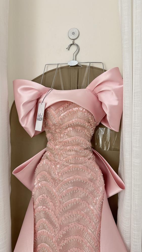 فستان سهرة فاخر بتصميم أنثوي أنيق، مصنوع من قماش لامع باللون الوردي الباستيل. يتميز بقصة ضيقة تبرز القوام، مع تطريزات براقة بشكل هندسي متناسق يغطي كامل الجزء الأمامي من الفستان. الجزء العلوي بدون أكمام وبصدر مكشوف، ومزين بفيونكة ضخمة على الكتفين تضيف لمسة درامية راقية. أما التنورة، فهي مكونة من طبقتين: داخلية ضيقة مرصعة بالكامل، وخارجية طويلة مفتوحة من الأمام تنسدل بانسيابية لتعطي الفستان طابعًا ملكيًا فاخرًا. التصميم مثالي للمناسبات الرسمية والسهرات الراقية.