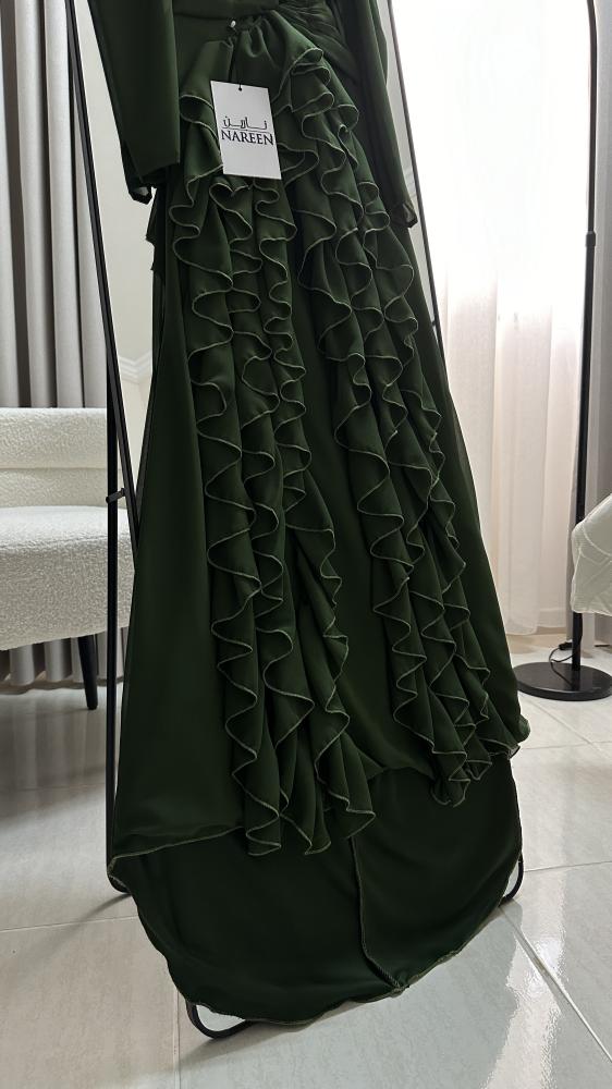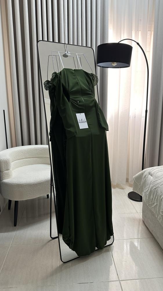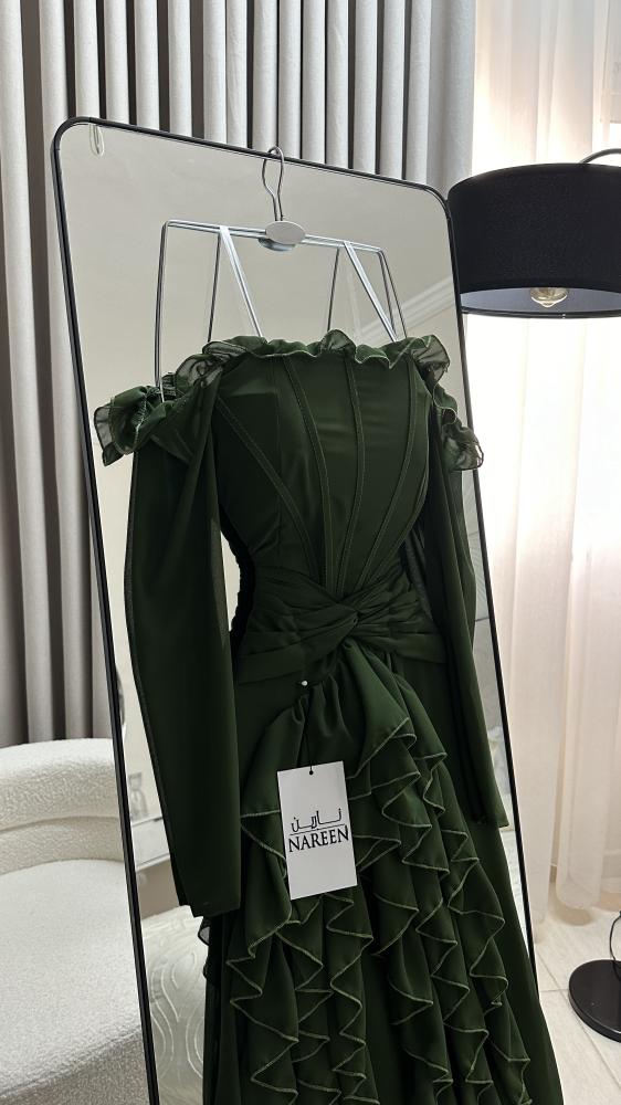 فستان سهرة فاخر بلون زيتي أنيق، يتميّز بتصميم أوف شولدر يبرز الأكتاف بأسلوب راقٍ وأنثوي. يأتي بقماش ناعم وانسيابي مع كورسيه مُفصّل يبرز جمال الخصر ويضفي لمسة فخمة على القوام. الجزء الأمامي مزين بكشكشات طولية متدرجة تضيف حركة وأناقة ملوكية للفستان، مع ربطة ناعمة عند الخصر تزيد من جاذبية التصميم. الأكمام الطويلة تضيف لمسة من الفخامة، بينما اللون العميق يمنح إطلالة راقية ومميزة تناسب المناسبات المسائية والسهرات الفاخرة.
