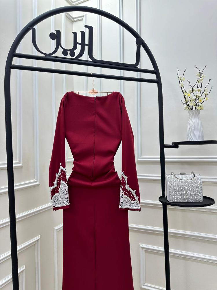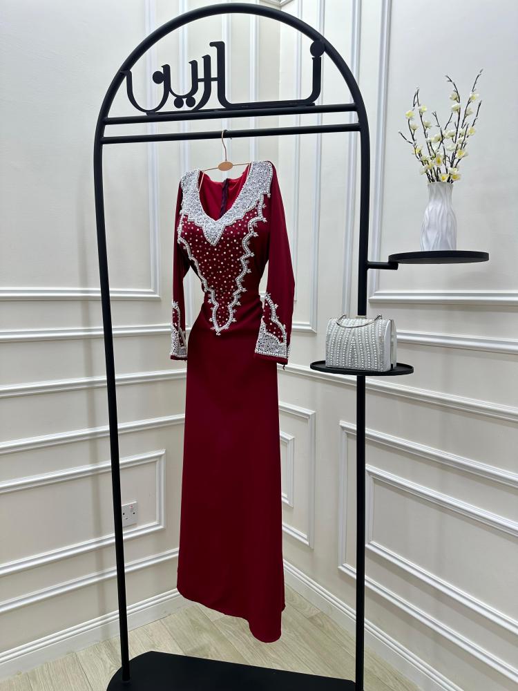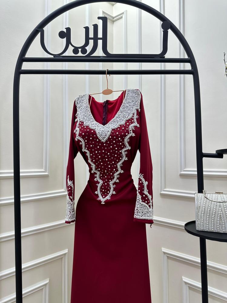 الجلابيهالظاهره في الصورة هو جلابيه سهرة طويل وأنيق باللون العنابي الغامق. يتميز بتصميم راقٍ مزين بتطريزات فاخرة من الخرز والكريستال الفضي اللامع حول الرقبة وعلى الأكمام وفي منطقة الصدر والبطن، مما يضيف له لمسة فخامة وتألق. الأكمام طويلة وضيقة، والتطريز يمتد بطريقة متناظرة تعزز من إبراز شكل الجسم.