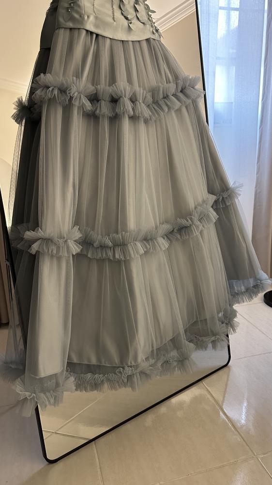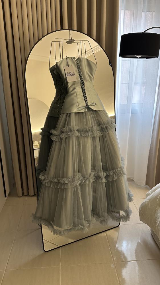 فستان سهرة أنيق بلون أخضر باستيل ناعم، يتميز بتصميم راقٍ يجمع بين الفخامة والأنوثة. الجزء العلوي قصّة بدون أكمام مع كورسيه مزين بلمسات بارزة على شكل أوراق وزهور ثلاثية الأبعاد مع خرز لامع يضيف لمسة فاخرة. تنسدل التنورة بطبقات متعددة من التول الناعم المزينة بكشاكش رقيقة بشكل دائري يمنحها حجماً انسيابياً ومظهراً ملكياً جذاباً. تصميم مثالي للمناسبات الراقية يمنح إطلالة ساحرة تلفت الأنظار.