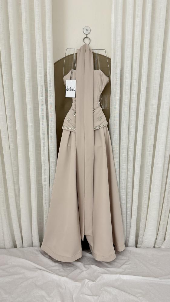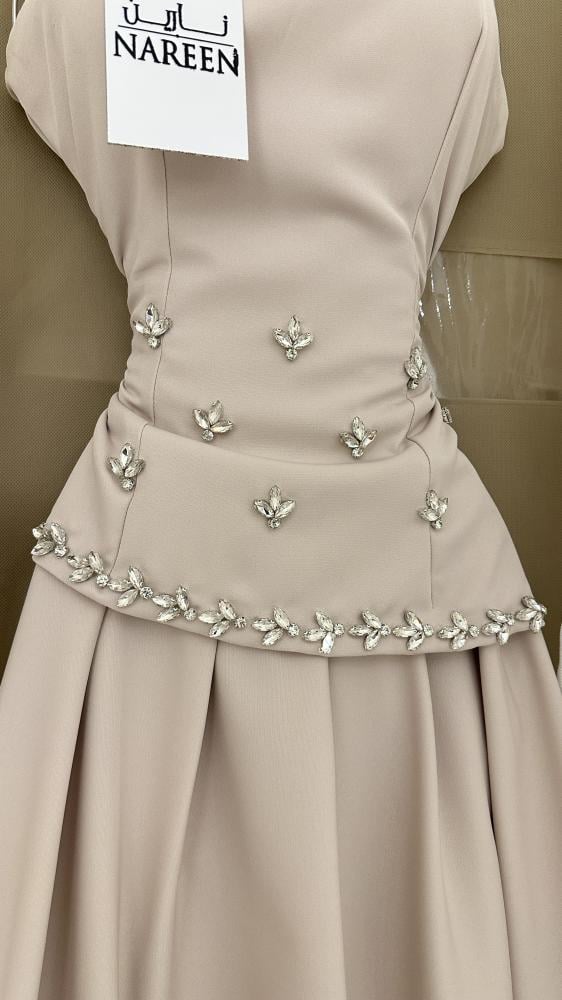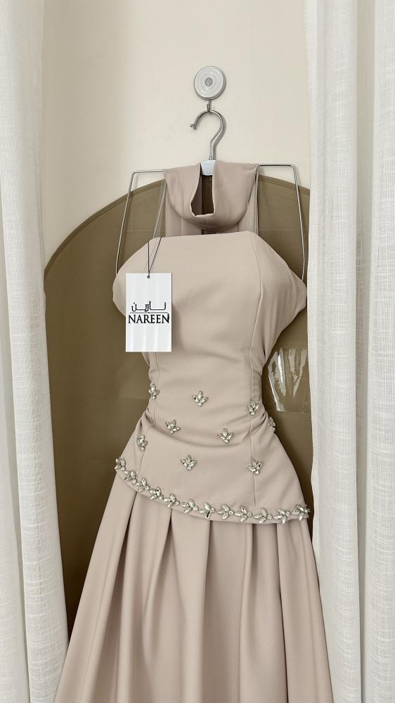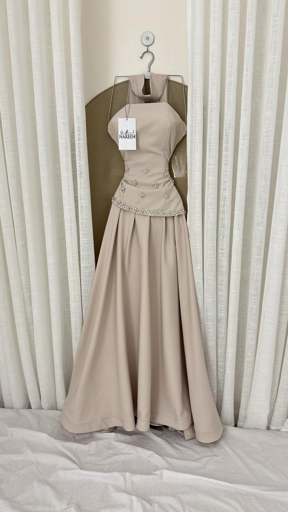 فستان أنيق بلون بيج هادئ يتميز بتصميمه الراقي والبسيط. يأتي الفستان بقصة علوية ضيقة على شكل كورسيه تُبرز الخصر، مع ياقة مرتفعة تضيف لمسة من الفخامة. يزين الجزء العلوي تطريز ناعم من الخرز والكريستالات اللامعة على شكل زخارف متناثرة، مع شريط مطرّز عند الخصر يمنحه طابعًا أنثويًا جذابًا.
