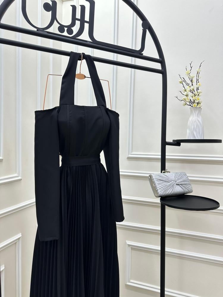 الفستان في الصورة أنيق وراقي، يتميز بلونه الأسود الكلاسيكي. تصميمه فريد من نوعه ويجمع بين الأناقة والعصرية، حيث يحتوي على: