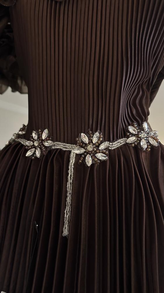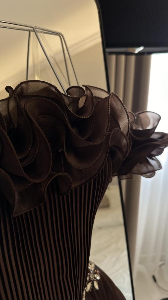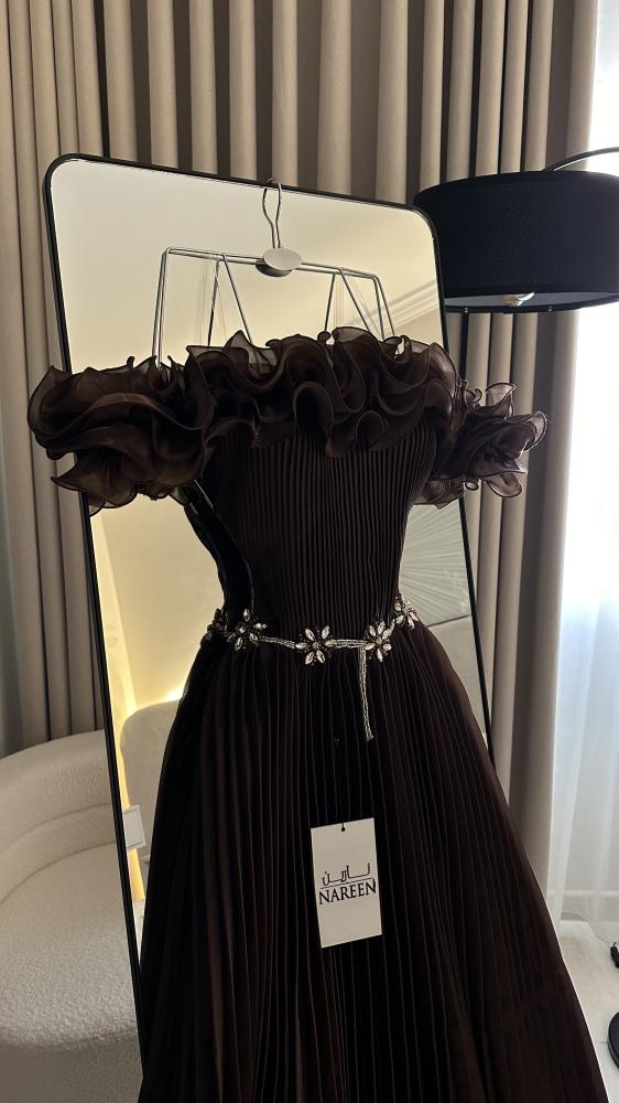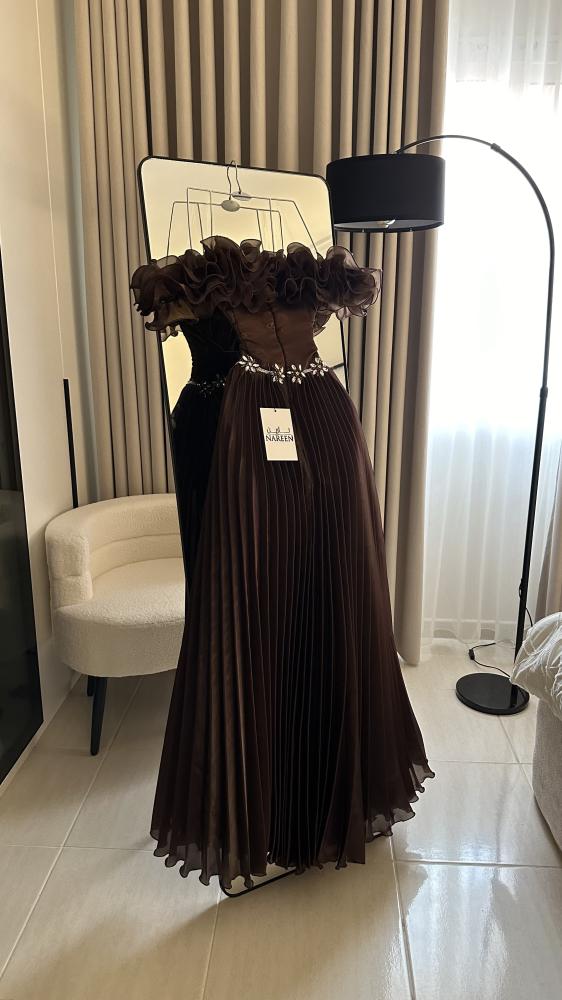 فستان سهرة فاخر بلون بني داكن، يتميز بتصميم أنيق يجمع بين الفخامة والنعومة. جاء بقصة أوف شولدر مع فتحة صدر مزيّنة بكشكشات كبيرة متدرجة تمنح إطلالة ملكية لافتة. الصدر مشدود بخطوط طولية بارزة تزيد من نحافة القوام، بينما تنسدل التنورة بقصة واسعة ماكسي مكوّنة من طيات "بليسيه" ناعمة تضيف حركة وانسيابية راقية مع كل خطوة.