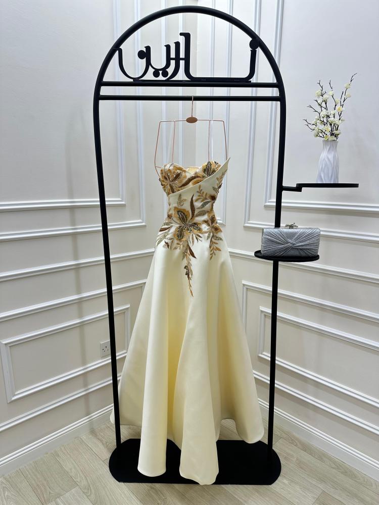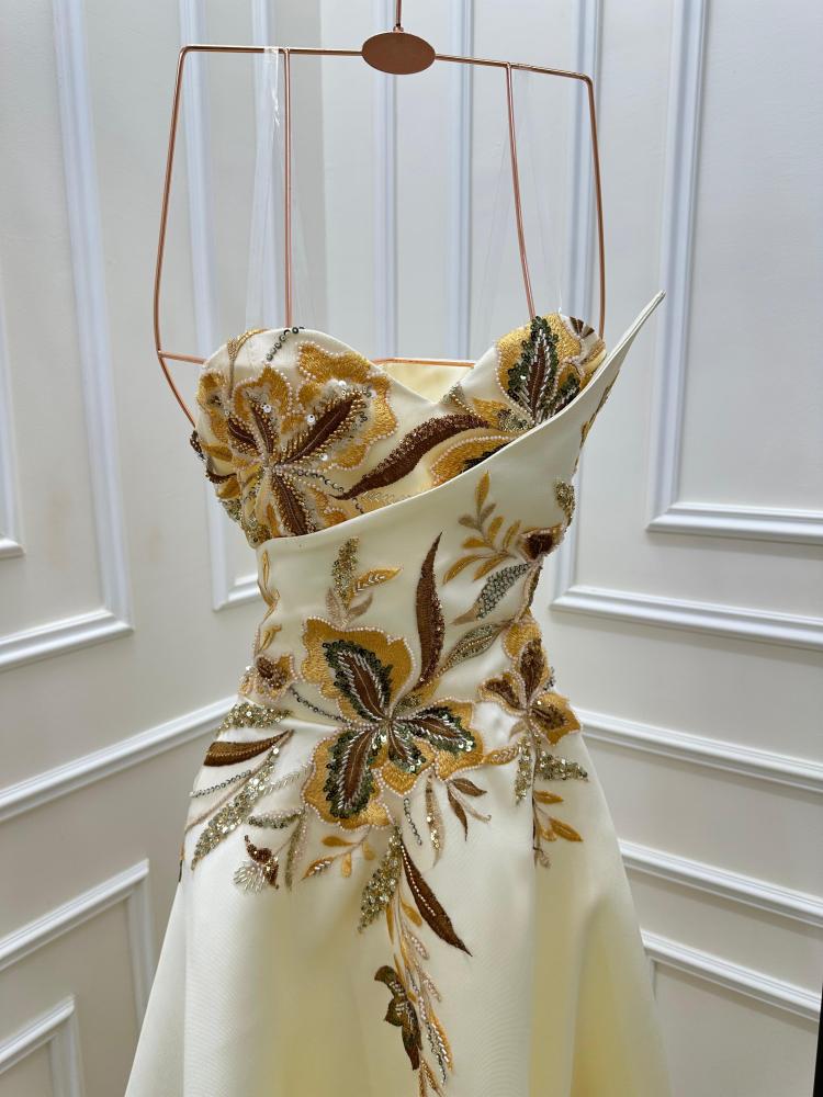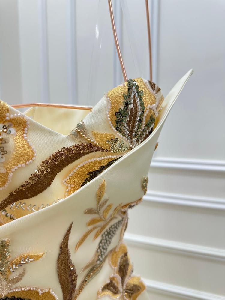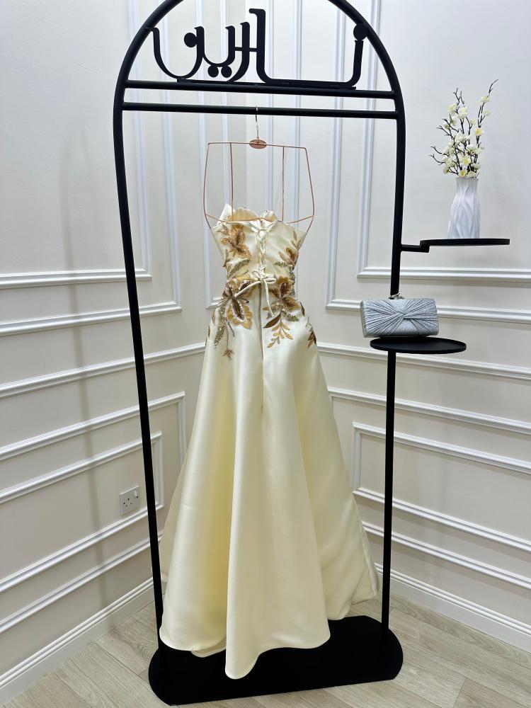 فستان سهرة أنيق بلون كريمي فاتح، يتميز بتصميمه الراقي والفاخر. الجزء العلوي من الفستان مزين بتطريزات يدوية دقيقة على شكل أوراق وزهور بألوان ذهبية وبنية لامعة، مما يضفي عليه لمسة فخامة. يتميز الفستان بقصة علوية بدون أكتاف (سترابلس) مع تصميم غير متماثل عند الصدر، ما يضيف له طابعاً عصرياً.
