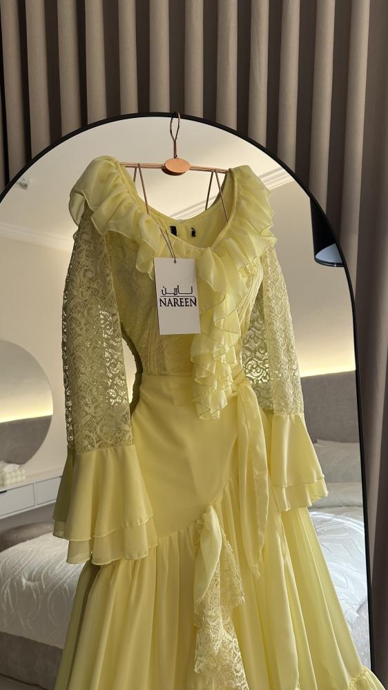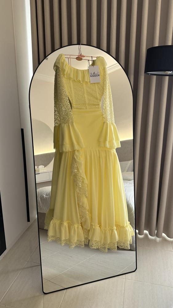 فستان أنيق بلون أصفر مشرق، يجمع بين الطابع الكلاسيكي والأنوثة الناعمة. يتميز بتصميم طويل بقصة واسعة من الأسفل مزينة بطبقات كشكش متدرجة من القماش والدانتيل، مما يمنحه حركة راقصة ولمسة رومانسية. الأكمام طويلة من الدانتيل الشفاف تنتهي بكشكش عريض يضيف لمسة درامية أنثوية. يزين الصدر كشكش ممتد بشكل طولي مع ربطة ناعمة عند الخصر، مما يبرز جمال القوام ويزيد الفستان فخامة. اختيار مثالي للمناسبات الخاصة والظهور بإطلالة مميزة تجمع بين الرقي والجرأة العصرية.
