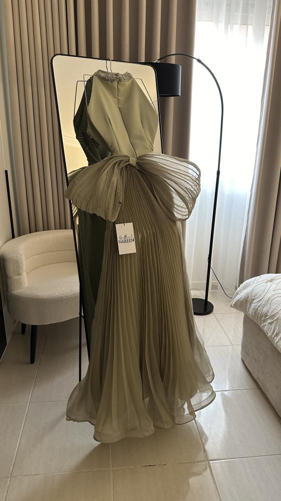 الفستان في الصورة أنيق وفخم، مصمم بلون أخضر زيتي فاتح مائل للذهبي يمنحه لمسة راقية وهادئة.
